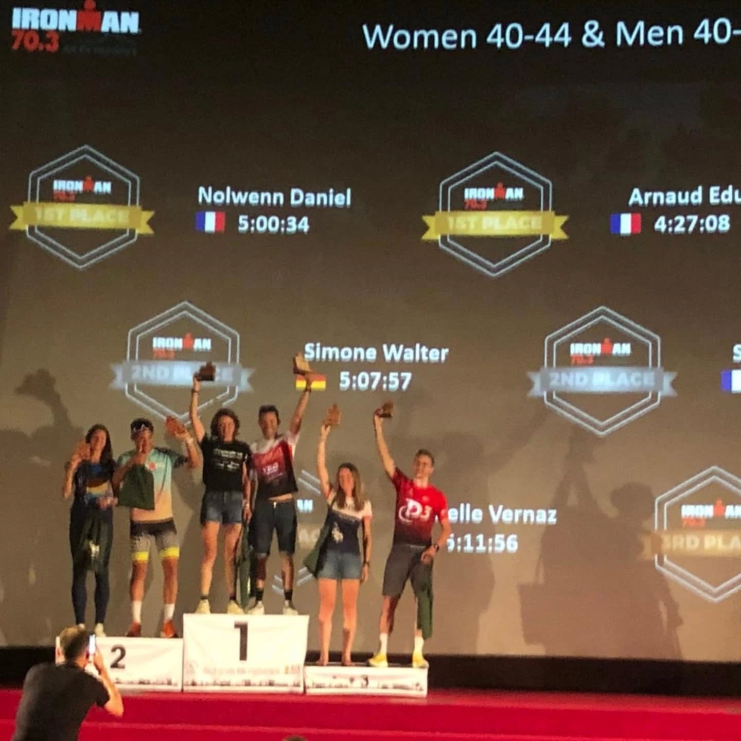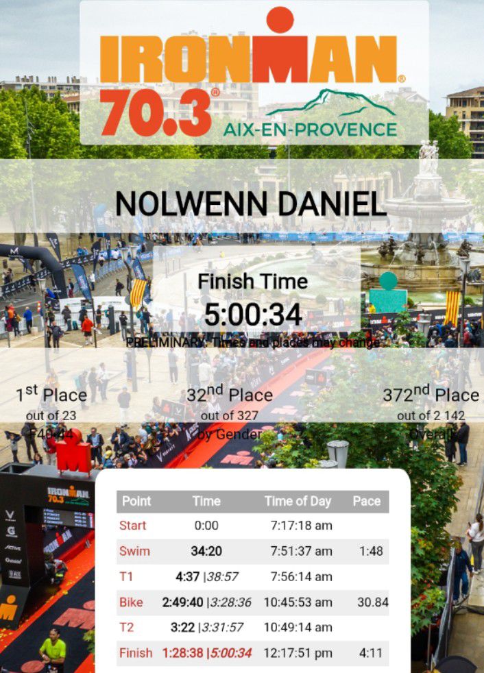 Nolwenn Daniel : 1ère de la catégorie W40-44. Temps total : 5h00m37s. Natation : 30m21s / Vélo : 2h49m01s / Course à pied : 1h32m37s.